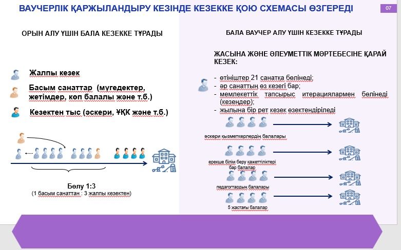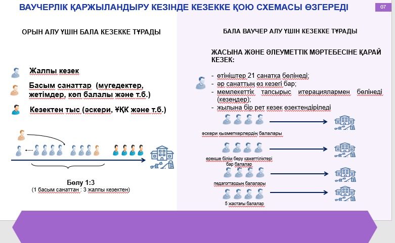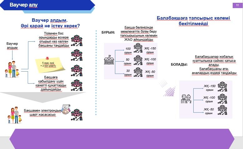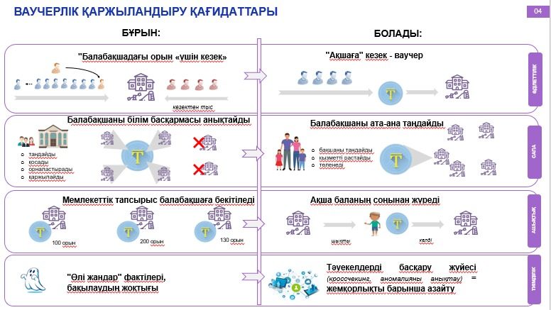 Ата-ана қай балабақшаны (мемлекеттік немесе жекеменшік) таңдаса, сол ұйым мемлекет бөлген ваучер бойынша қаржыландырылады.
