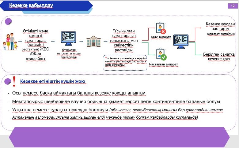 Бала тіркеледі – ата-ана баласын электрондық жүйе (мысалы aqmola.kz) арқылы кезекке қояды.