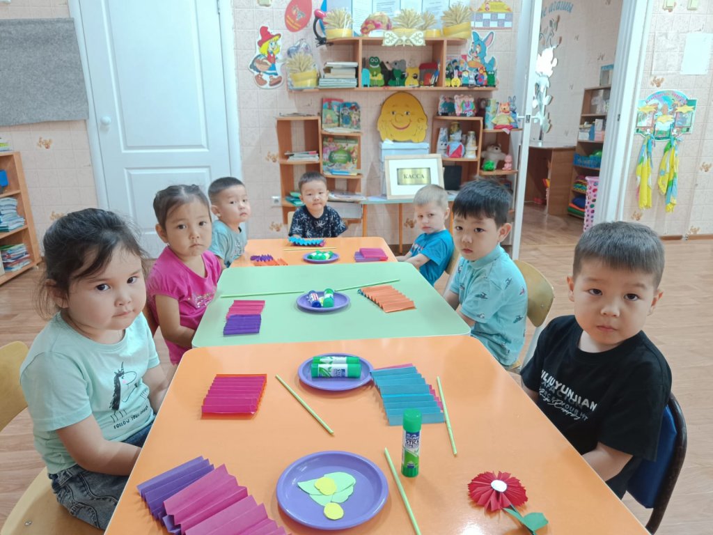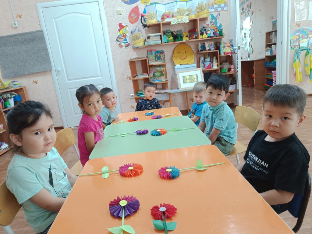 Сондай-ақ балалармен гүл туралы қызықты шығарма оқылып, мазмұны талқыланды. Тәрбиешілермен әсерлерімен бөлісті. Бесіктен кейін балалар түрлі-түсті қағаздан өз қолдарымен әсем гүлдер жасап, оларды бірігіп үлкен ұжымдық жұмысқа айналдырды.