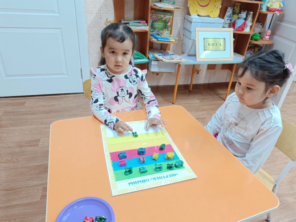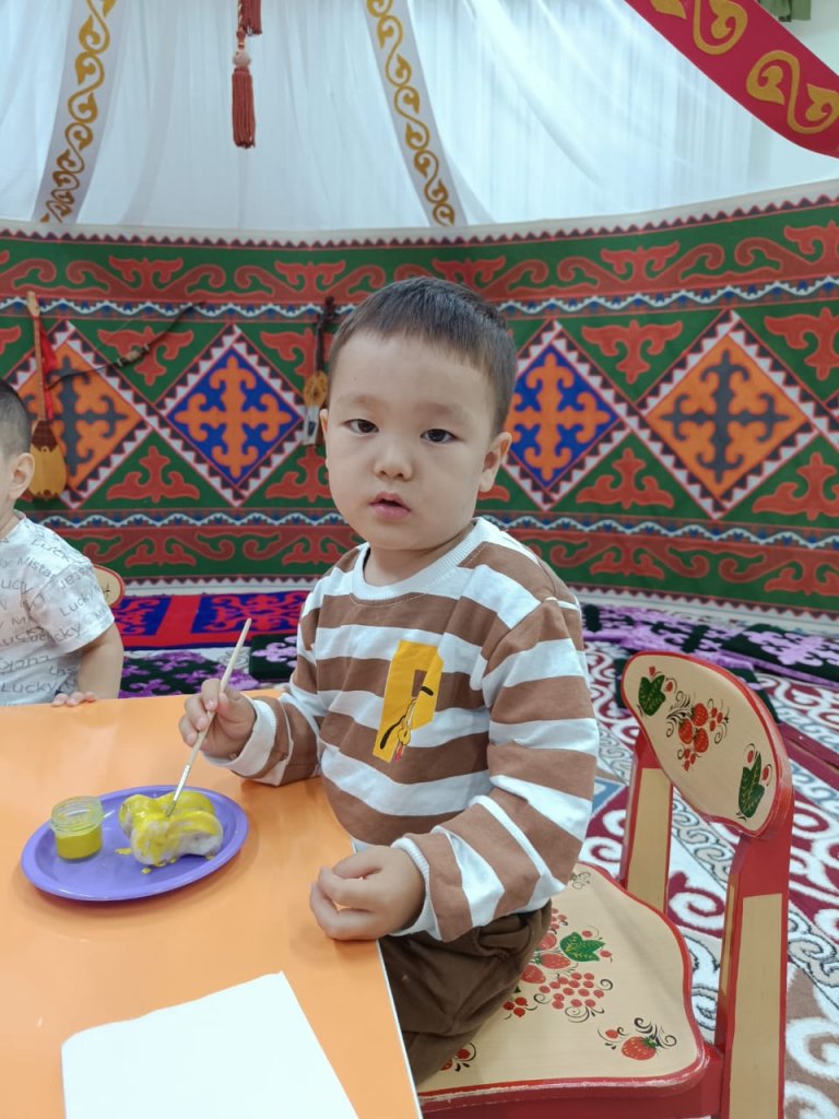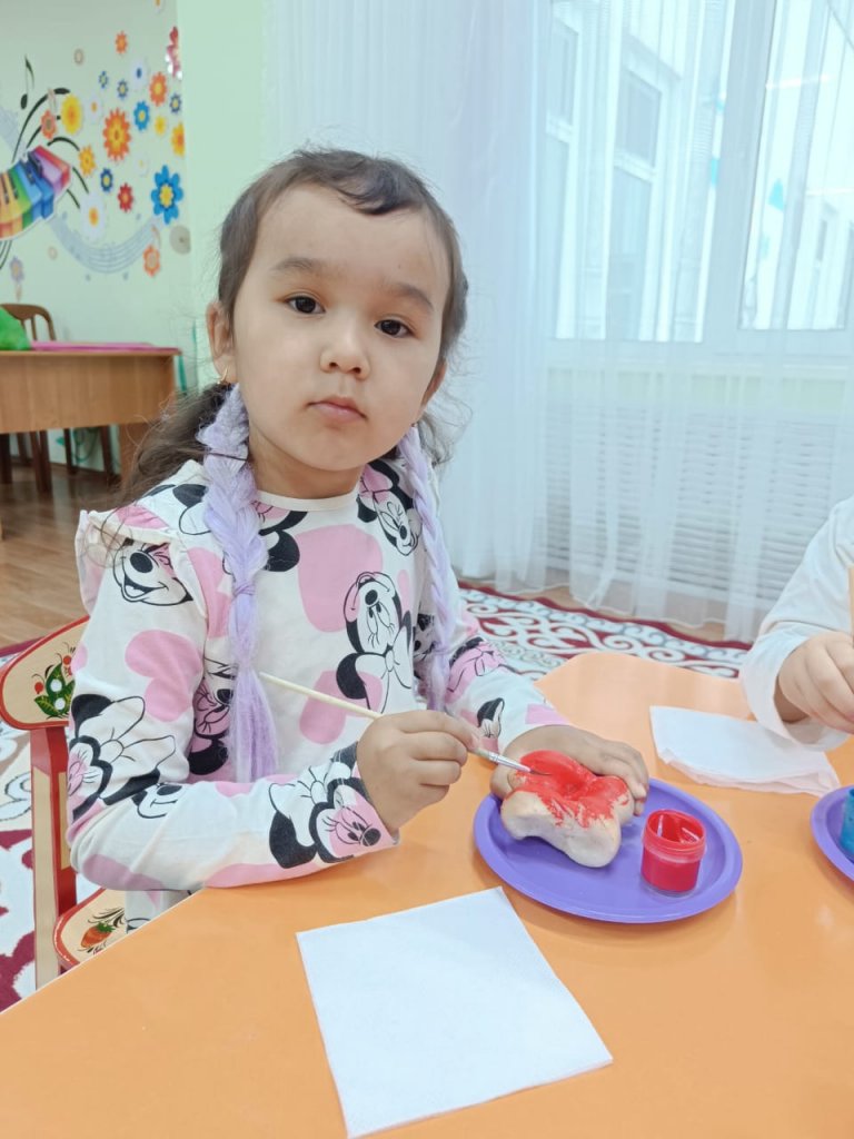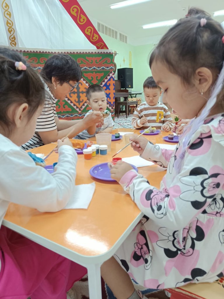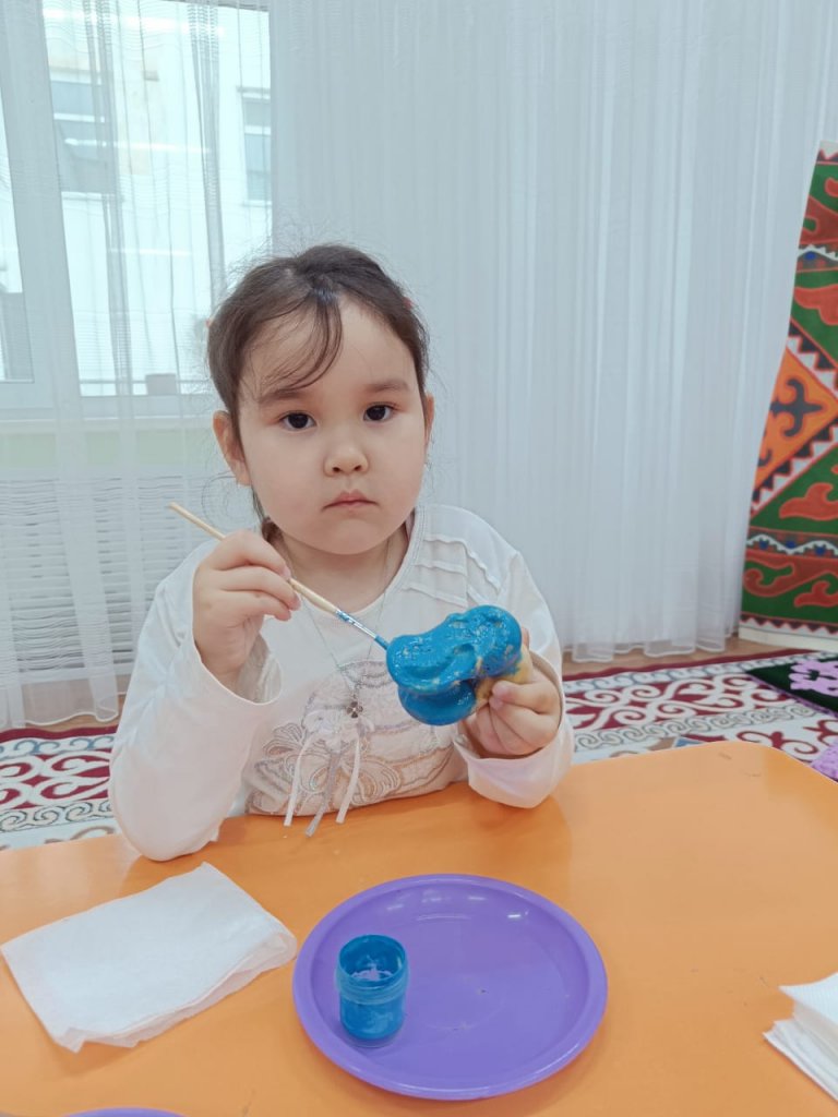 Сондай-ақ балалар ағаш пен саздан жасалған асықтарды бояумен безендірді. Олар дайын бояуларды пайдаланып, әрқайсысы өз туындысын жасап шықты. Кейін «Асықты саламыз» атты шығармашылық сабақ өтіп, балалар асықты қағаз бетіне түрлі бояулармен бейнеледі.