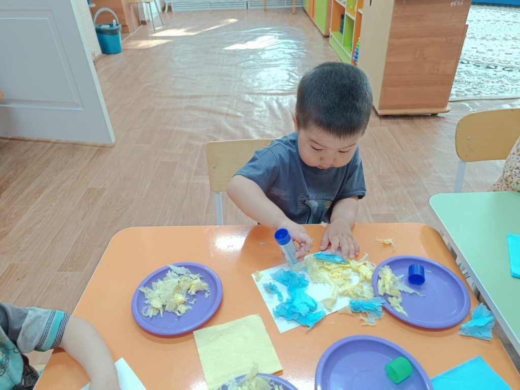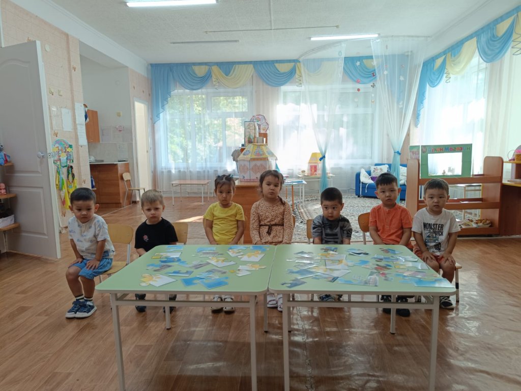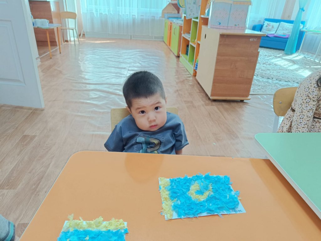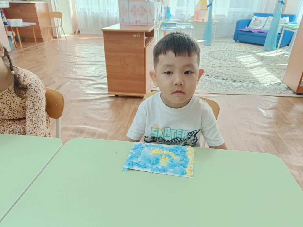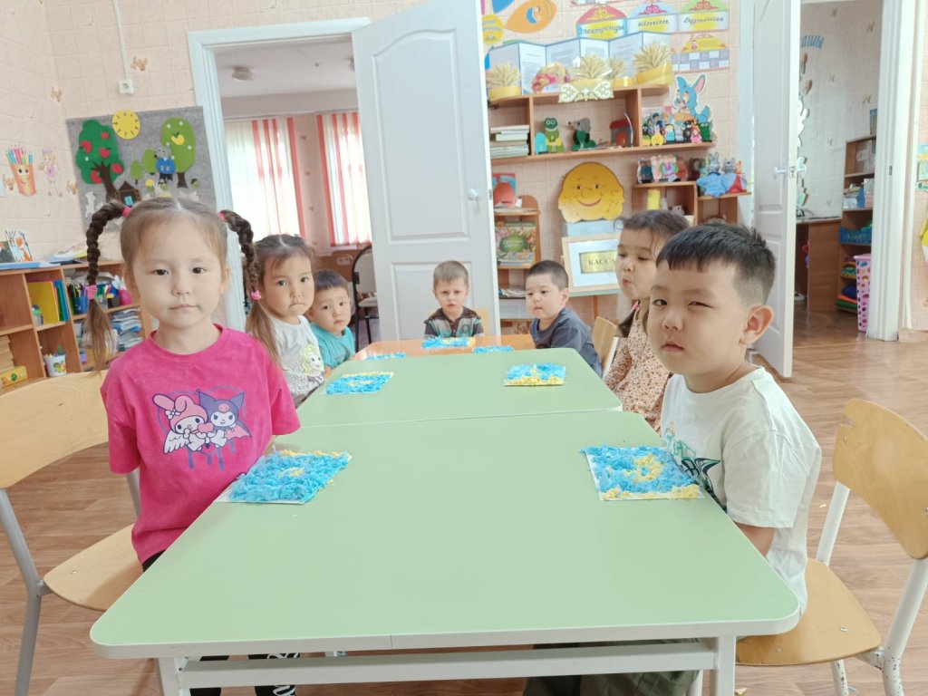 Балалар аппликация жасап, өз Отанына деген сүйіспеншілігін сурет арқылы жеткізді. Олар күн, тау, көк ту, даланы бейнелеп, өз елінің сұлулығын қағаз бетіне түсірді.